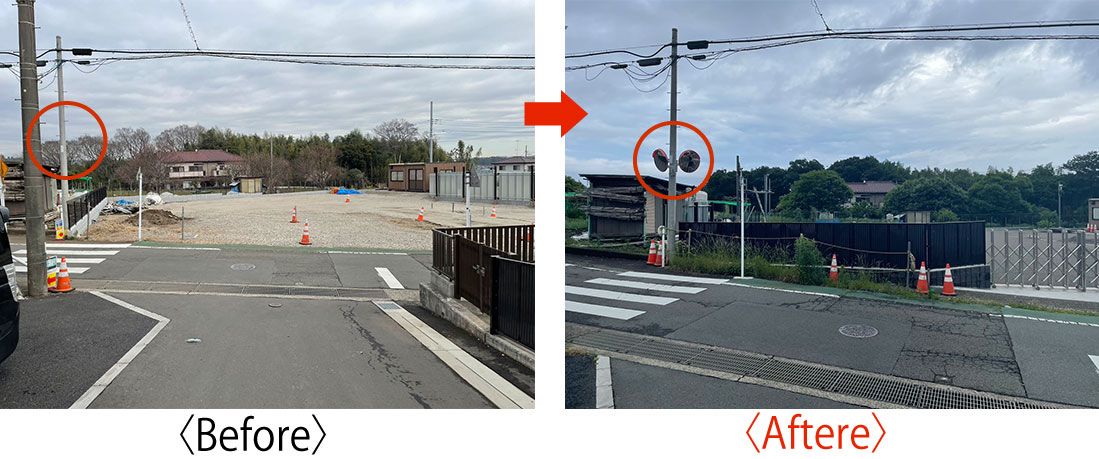 セットバック等の工事の関係でカーブミラーを取り付けるまでに時間がかかってしまいましたが、設置後には住民の方から、以前よりも安心して通れるようになったとのお声もいただきました。